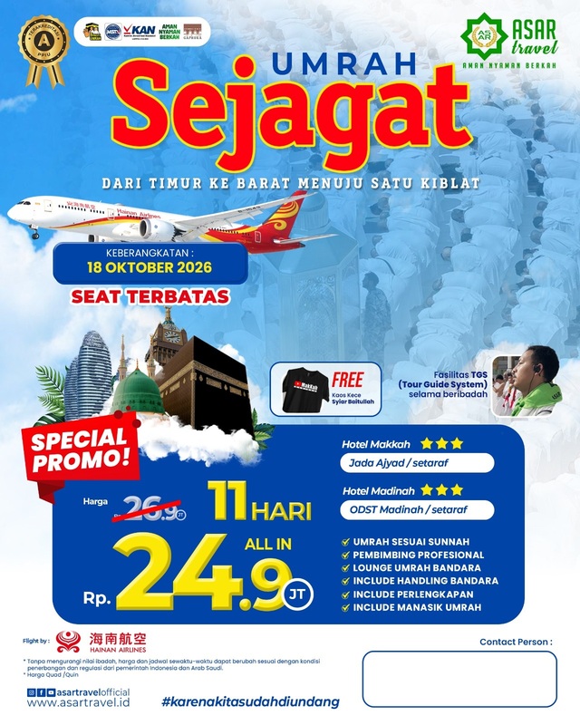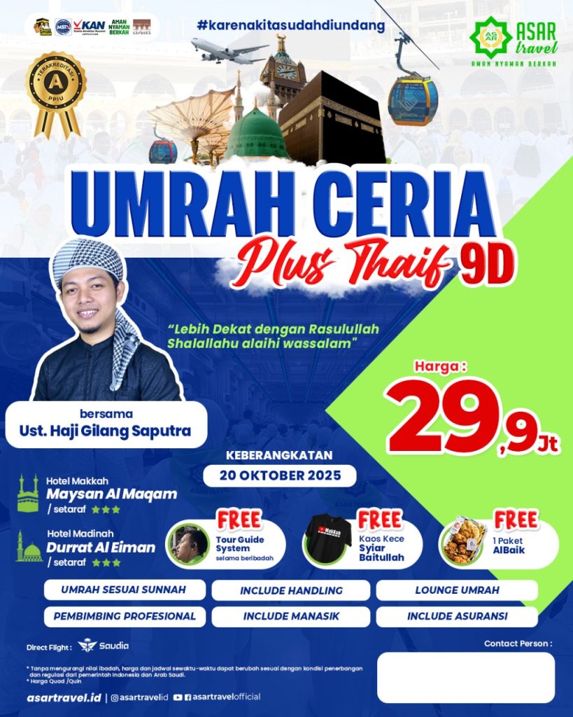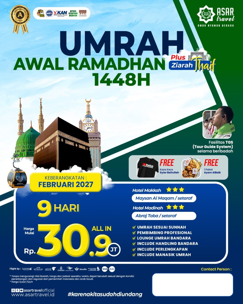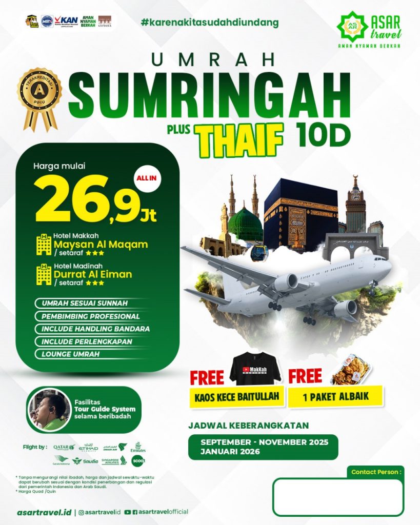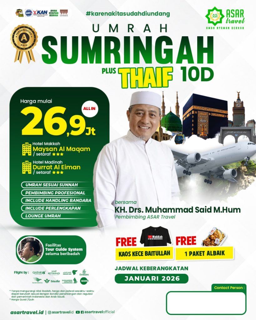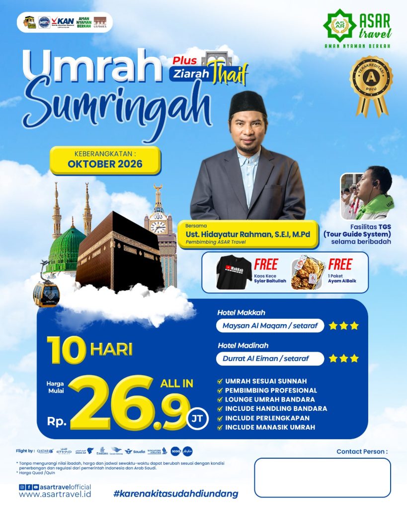 Pembimbing ibadah Umrah ASAR Travel adalah mereka yang memiliki kafaah Syar'i. Jamaah difasilitasi Tour Guide System selama prosesi Umrah. Dengan harga yang terjangkau, fasilitas jamaah maksimal.