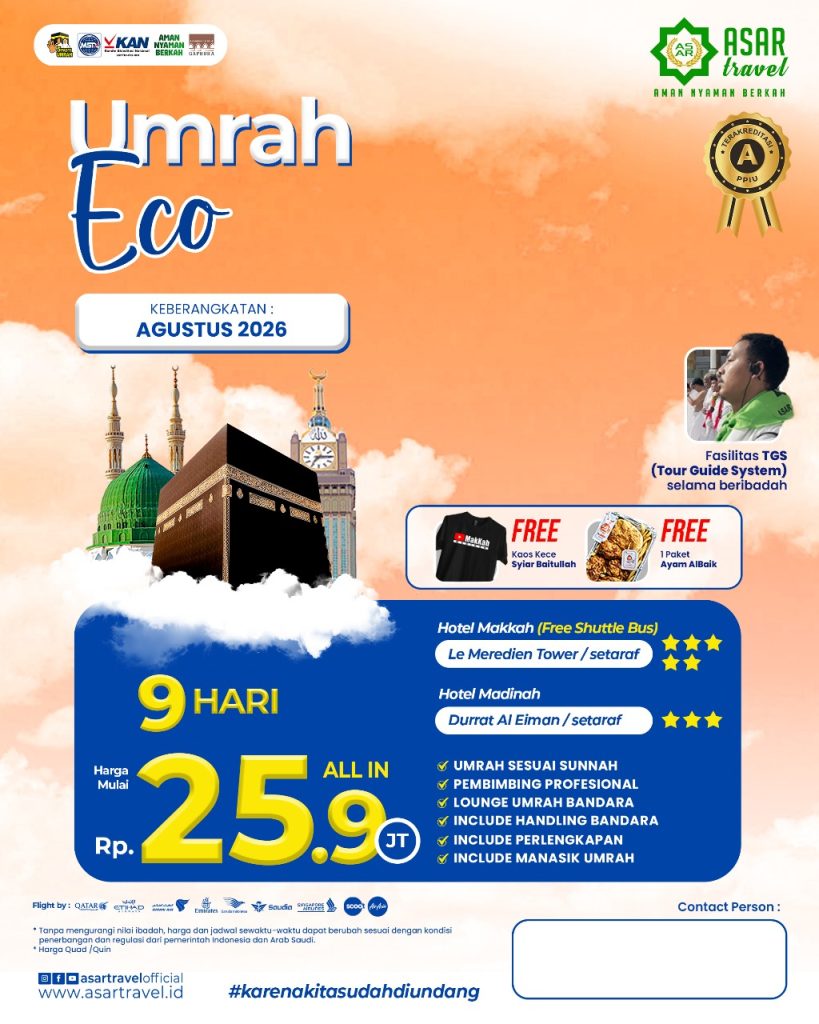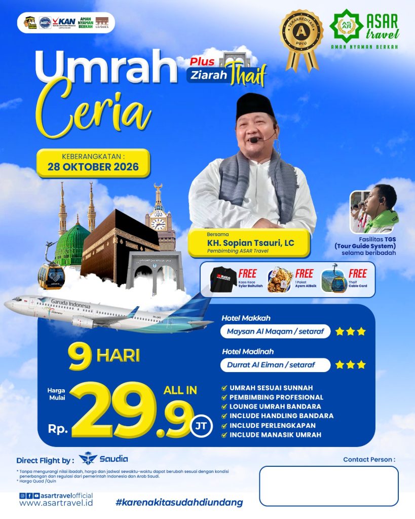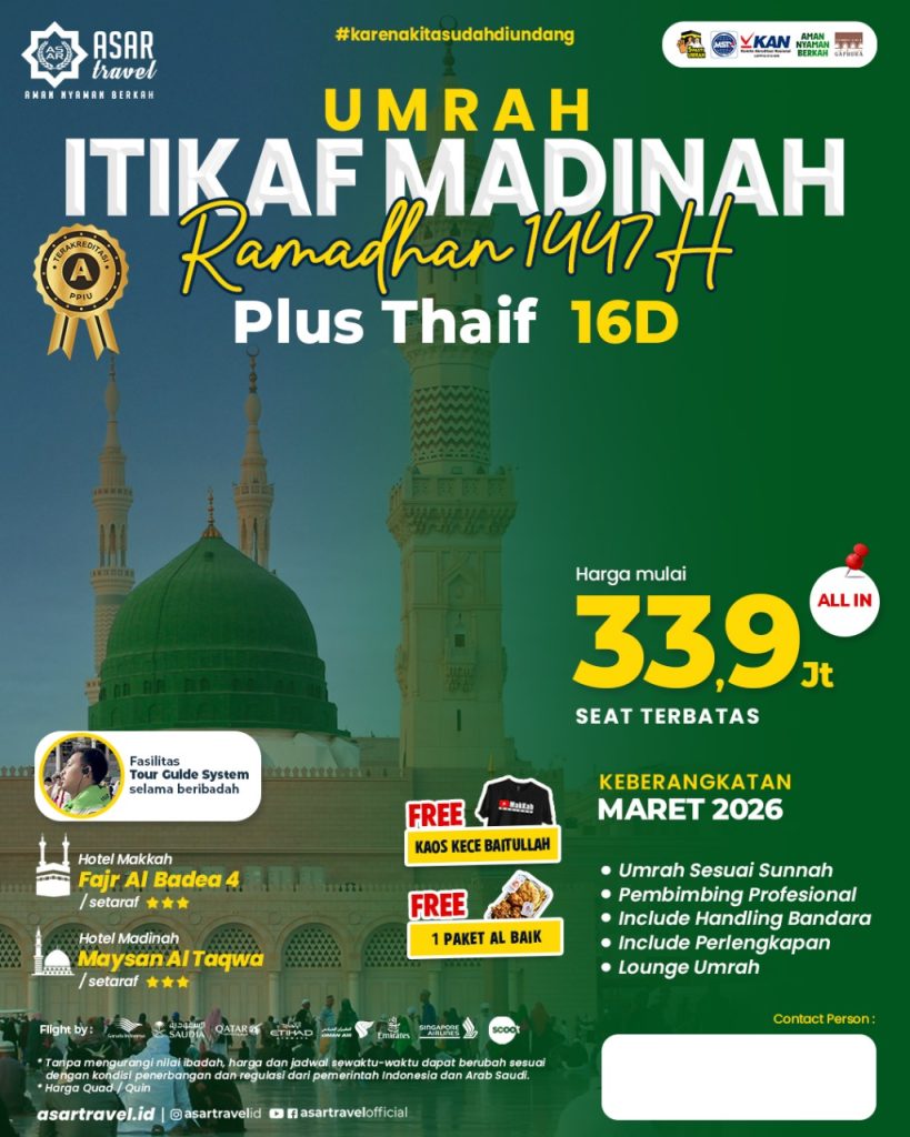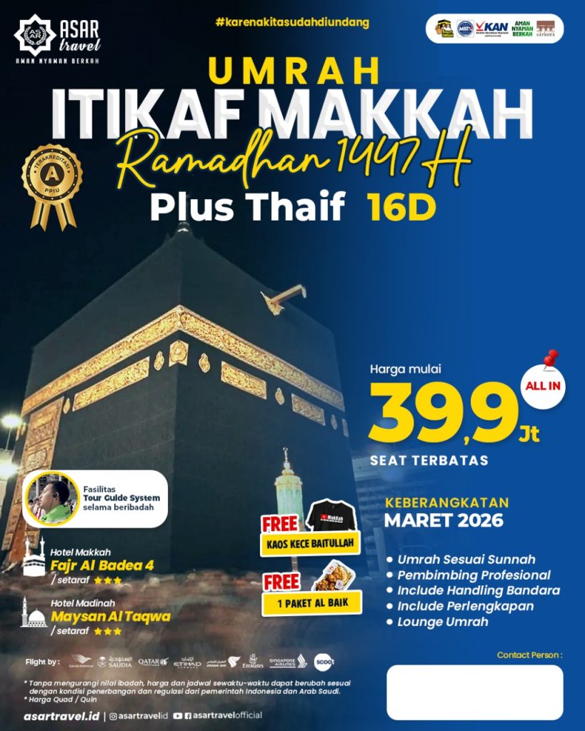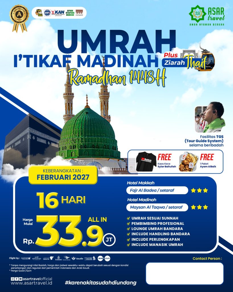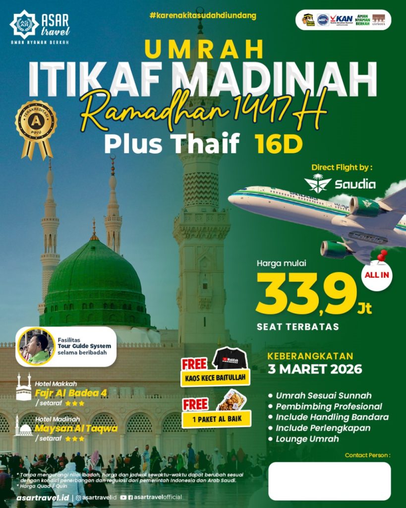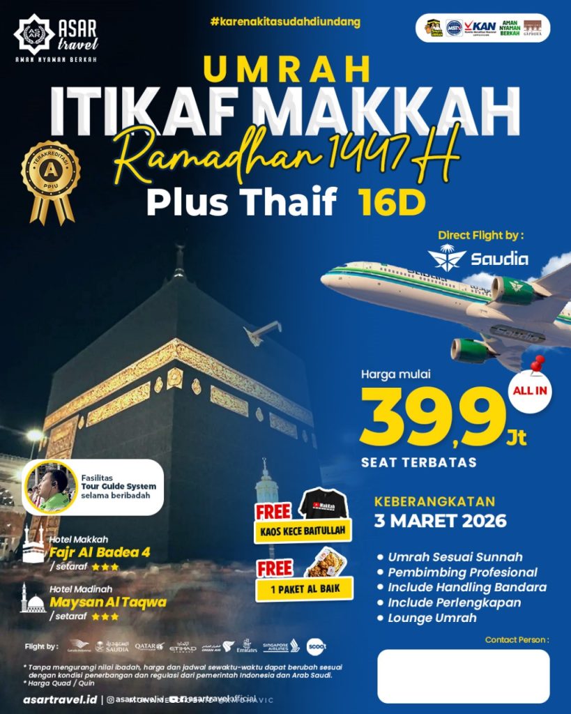 ASAR Travel berijin resmi PPIU no U.445/2021. Dengan nilai A pada akreditasi PPIU yang dilakukan oleh Lembaga KAN. Menempati Gedung milik sendiri. Tiket dan visa akan dibagikan di grup jamaah sebelum keberangkatan.